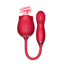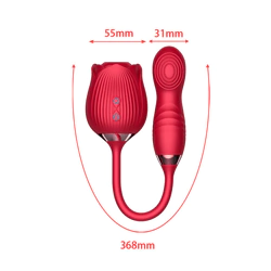 Estimulador clitoriano duplo em formato de flor, sendo: Um estimulador por ondas de pressão em formato de flor e um estimulador do ponto G. Possui toque suave, aveludado e detalhes metalizados.